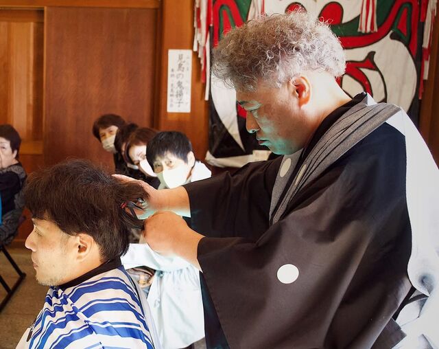 今年は「床屋発祥の地記念碑」建立30周年記念という節目で、古式神事に則り、裃姿の望月義弘氏により、男性の髪をその場で切って神殿に奉納する「髪落としの儀」が行われました。